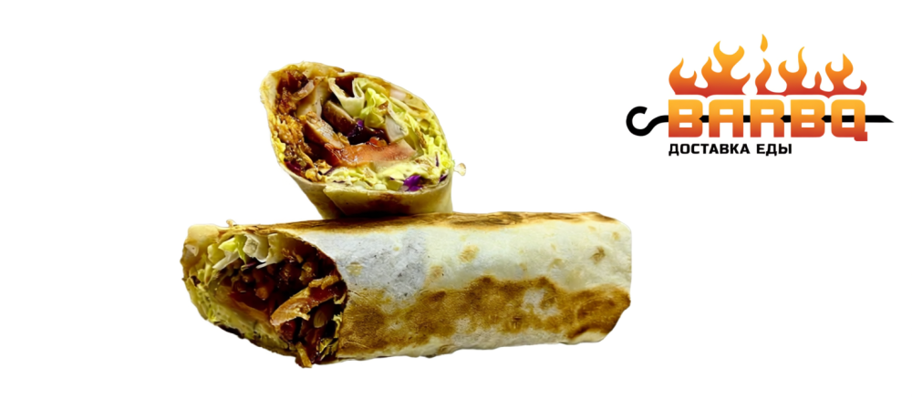 Лаваш, шашлык на выбор (курица или свинина), микс капусты, огурец маринованный, жаренный лук, томат, соус барбекю, лук зелень.